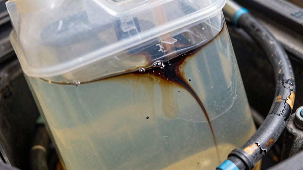 Imagine your brake system crying out for help. You’ll notice rubber swelling and fluid discoloration as clear signs of degradation. These symptoms indicate rubber’s failing health, succumbing to harmful petroleum exposure. When rubber swells or fluid turns dark or cloudy, it’s a warning that contamination is damaging your brake components. Don’t overlook these signs—act quickly to prevent costly repairs and ensure your vehicle’s safety.