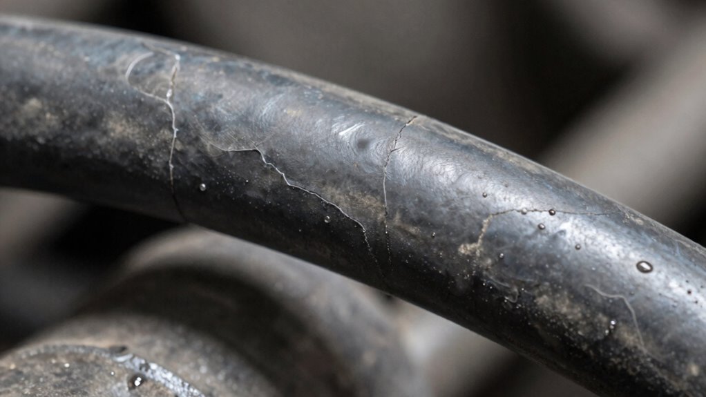A brake hose swell occurs when the rubber material of your brake hose begins to expand or bulge due to internal damage or deterioration. This swelling isn’t just a minor inconvenience—it can compromise your braking performance and safety. When the hose material starts to weaken from age, heat, or exposure to harsh elements, it loses its ability to resist internal pressure, leading to swelling. Over time, the rubber becomes softer and less resilient, making it more susceptible to expansion under brake system pressure. Brake hose durability is crucial in preventing such issues and ensuring safe vehicle operation. One key factor that influences hose durability is the brake fluid compatibility. Not all brake fluids are created equal; some can react with the rubber compounds used in your brake hoses. Using incompatible brake fluids can accelerate the deterioration of the hose material, causing it to swell prematurely. For example, DOT 3, DOT 4, and DOT 5.1 brake fluids are generally compatible with most rubber hoses, but certain additives in specific formulations might weaken the hose over time. Ensuring you use the correct brake fluid recommended by your vehicle’s manufacturer helps maintain the integrity of the hose material and prevents swelling issues. Hose material durability plays an essential role in preventing a brake hose swell. High-quality hoses are constructed with rubber compounds designed to withstand high internal pressures and resist chemical reactions with brake fluids. These hoses often feature reinforcement layers made of braided steel or synthetic fibers for added strength and flexibility. When you choose hoses with superior material durability, you reduce the risk of swelling, cracking, or bursting. Cheaper, lower-quality hoses might initially seem cost-effective, but they tend to deteriorate faster, leading to swelling and potential brake failure. Regular inspections are fundamental in catching early signs of hose deterioration. Look for soft spots, bulges, or any visible signs of wear and tear. A swollen hose might feel spongy or soft when you squeeze it, indicating internal damage. Replacing hoses before they fail is essential to maintaining reliable braking performance. If you notice a soft pedal or inconsistent braking, don’t ignore it; it could be a sign that your hose has swollen internally and may burst under pressure.