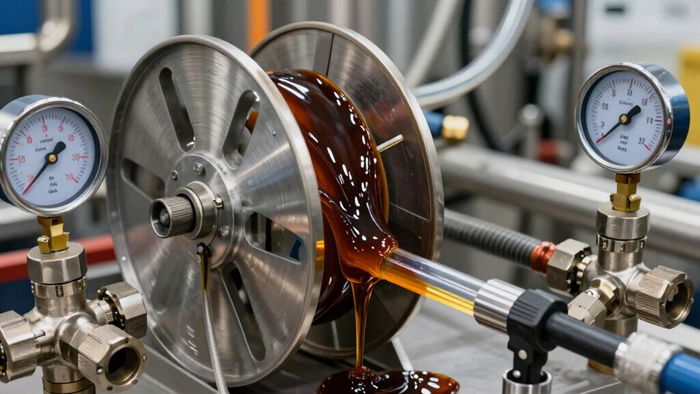 Temperature fluctuations can markedly impact pressure surges in grease systems. As temperature rises, viscosity decreases, making the grease thinner and easier to flow, which may lead to pressure drops or surges. Conversely, lower temperatures increase viscosity, causing the grease to become thicker and potentially creating higher pressure build-ups. You should monitor temperature changes closely to adjust system parameters and prevent pressure surges caused by these viscosity variations.