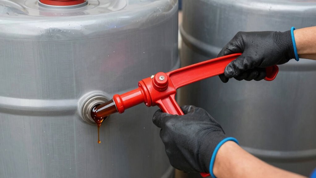 Re-priming your grease pump is a straightforward process that guarantees consistent lubrication and prevents equipment downtime. First, verify your pump accessories, like fittings and hoses, are clean and properly connected. Turn off the pump and check the lubricant quality; old or contaminated grease can cause priming issues. Next, loosen the bleed screw to release trapped air, then slowly pour fresh lubricant into the reservoir until it reaches the fill line. Close the bleed screw securely. Turn the pump back on and observe the flow. If air bubbles persist, repeat the process. Regularly inspecting lubricant quality and maintaining pump accessories assures smooth priming and peak performance, reducing risks of pump failure and prolonging equipment life.