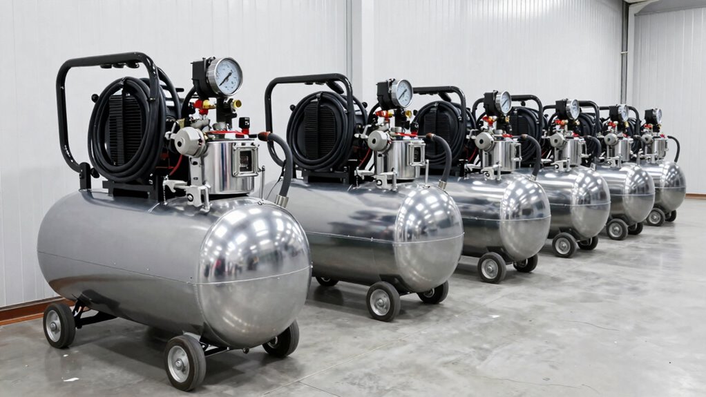Portability and size are essential factors when selecting a 60-gallon air compressor, as they directly influence how easily you can move and position the unit. These compressors typically measure between 33 and 66 inches in height and width, affecting their overall footprint. Portable models often come with wheels, handles, or ergonomic grips that make relocation simple, ideal for mobile or small workshop use. However, they tend to be lighter, usually around 255 pounds, making them easier to transport. In contrast, stationary units prioritize stability and often lack mobility features but are heavier—over 475 pounds—better suited for permanent installations. Consider your workspace size and mobility needs carefully to choose a unit that balances size and portability effectively.