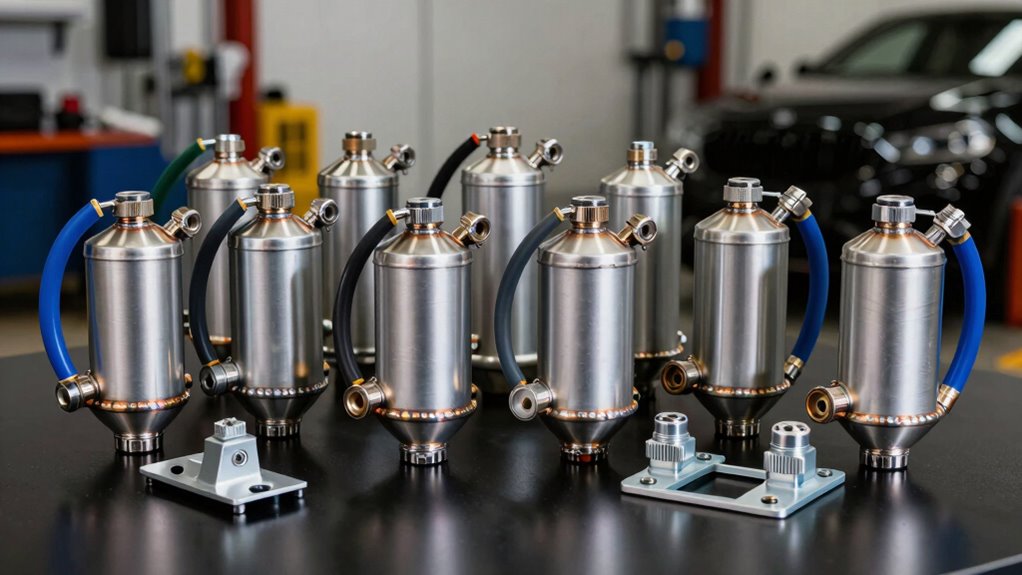 Selecting the right capacity and size for your baffled oil catch can kit depends on your vehicle’s needs and your maintenance preferences. Smaller cans, around 150ml, are ideal for compact engine bays and quick checks, making them convenient for regular maintenance. Larger capacities, like 500ml or more, are better suited for high-mileage vehicles or those driven aggressively, reducing how often you need to empty them. Keep in mind, bigger units often have increased height and diameter, which could pose installation challenges in tight spaces. It’s crucial to take into account your engine type, driving habits, and available space in your engine bay when choosing. Picking the right size ensures ideal performance without compromising fit or ease of maintenance.
