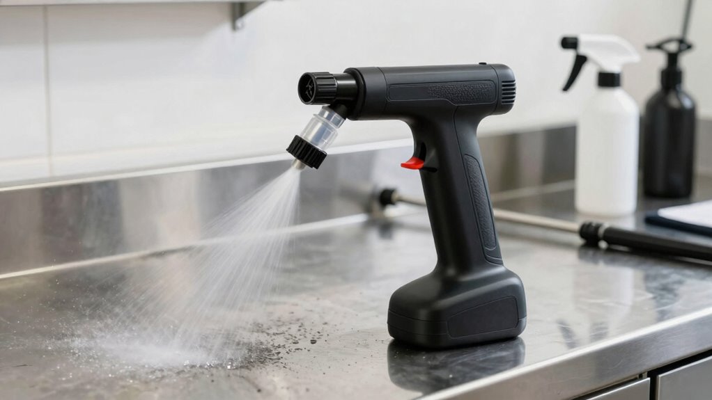 Choosing a sprayer that can withstand harsh chemicals starts with paying close attention to the materials used in its construction. For degreasers, I look for tanks made from chemical-resistant plastics like HDPE, polypropylene, or stainless steel, as these resist corrosion and degradation from strong solvents. High-quality plastics such as ABS or reinforced composites also boost longevity, especially with frequent use. Metal parts like nozzles and wands should be crafted from corrosion-resistant metals like brass or stainless steel for durability. Additionally, the seals—preferably Viton or EPDM—must be sealed and chemically resistant to prevent leaks and maintain integrity when working with aggressive degreasers. Overall, durable, chemical-resistant materials ensure the sprayer remains reliable over time, even under rigorous use.