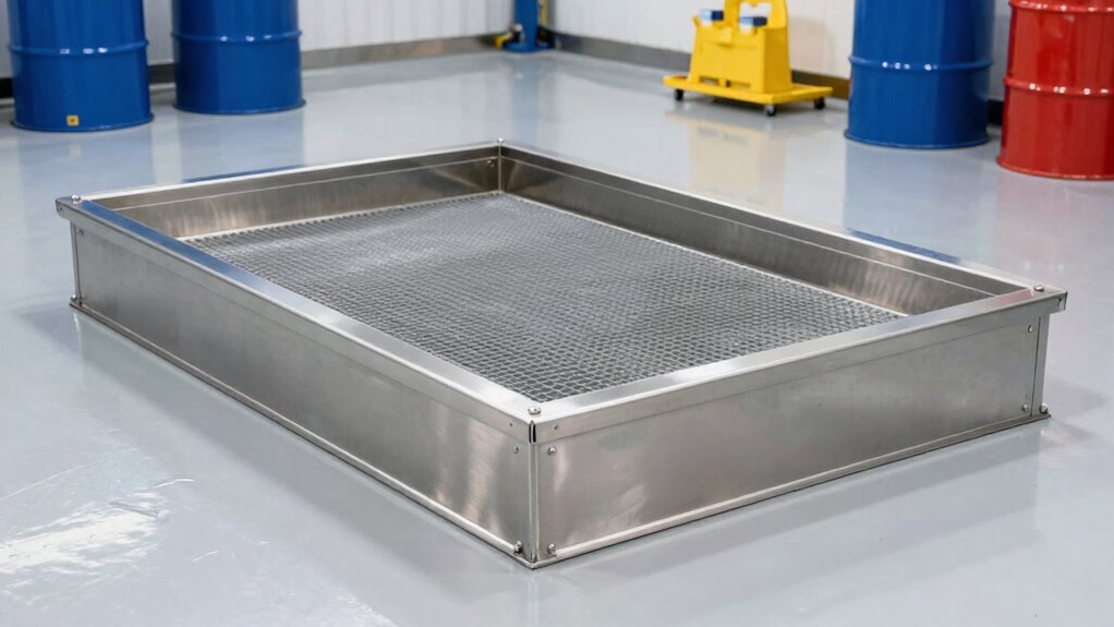 Durability and the right material are essential factors to contemplate because they directly impact the containment platform’s lifespan and safety. I recommend choosing platforms made from high-density polyethylene (HDPE) for excellent chemical resistance and impact resilience. It’s imperative that the material is UV-stabilized to prevent fading, cracking, and degradation, especially for outdoor environments. Ensuring the construction is seamless and leakproof helps eliminate spill risks and meets environmental standards. Reinforced walls and deep containment basins support heavy loads and effectively contain overflow. Additionally, a weatherproof finish is necessary, as it allows the platform to withstand harsh chemicals, oils, solvents, and extreme weather conditions. These features collectively guarantee long-lasting performance and safety in demanding industrial settings.