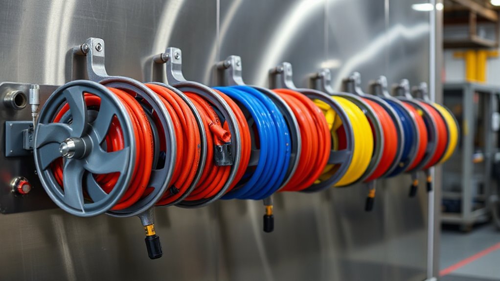 To guarantee safety and reliable performance, it’s crucial to select a hose reel with a pressure capacity that matches or exceeds your application’s requirements. You should verify the reel’s maximum pressure rating is at least equal to the highest pressure your fluids will experience, typically between 1,500 PSI and 5,800 PSI. For high-pressure applications, choosing reels rated above 2,300 PSI helps accommodate sudden surges and peak demands. It’s important to match the reel’s pressure capacity with your flow requirements to prevent leaks or hose failure. Also, check the pressure ratings of hoses rated for specific fluids like hydraulic oil or fuel. Aligning the reel’s pressure capacity with industry standards and equipment specifications ensures safety, prevents premature wear, and maintains peak performance over time.