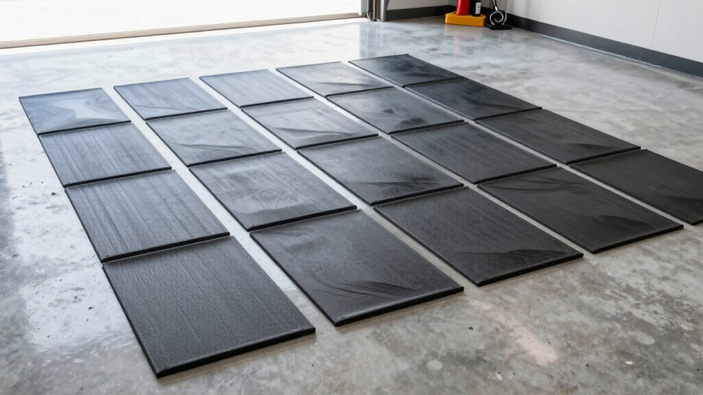 Selecting the right size and coverage area for oil resistant garage floor mats is key to ensuring maximum protection. I recommend measuring the space where the mat will sit to make sure it covers all potential spill zones, preventing leaks from reaching surrounding surfaces. It’s smart to choose a size that can comfortably accommodate your largest vehicle or equipment, ensuring full protection. If needed, look for mats with customizable dimensions or ones that can be cut to fit tricky shapes and tight spots. Keep in mind, larger mats offer more all-encompassing coverage, but they can be heavier and trickier to handle. Overlapping mats beyond the edges of your vehicle or work area can also help contain spills more effectively, offering extra peace of mind.