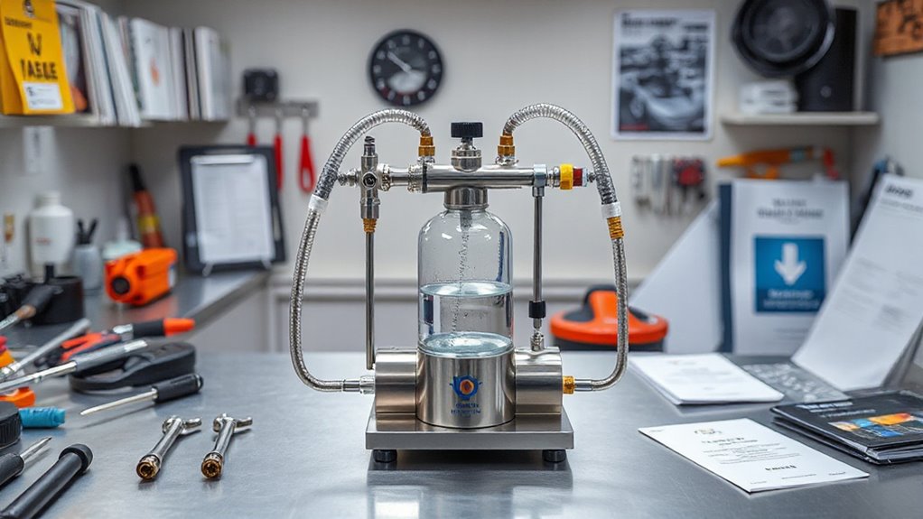 Selecting the right power source for a pneumatic oil dispenser kit is key to ensuring smooth and reliable operation. Since these kits run on compressed air, you’ll need an external air compressor. The compressor’s pressure capacity, measured in PSI or bar, affects how well the kit handles thick or high-viscosity oils. Most standard workshop compressors operate between 90-120 PSI, making compatibility straightforward. Some kits come with built-in regulators, allowing you to control air pressure precisely, which improves safety and accuracy. Consistent airflow is essential; an underpowered compressor can lead to inconsistent dispensing or reduced efficiency. Consequently, choosing a kit compatible with your existing compressor and ensuring it can deliver steady airflow is vital for peak performance. This consideration helps prevent interruptions and maintains a smooth workflow.
