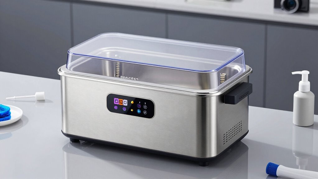 When evaluating ultrasonic cleaners, precise heating and temperature controls are crucial because they directly impact cleaning effectiveness and safety. Adjustable temperature settings, typically ranging from 32°F to 176°F, let me tailor the cleaning process to different materials and contaminants, ensuring ideal results. An ultrasonic cleaner with adjustable heating power heats solutions quickly, speeding up grime removal. Consistent temperature regulation prevents damage to delicate items by maintaining a stable environment throughout the cycle. Some models even feature automatic temperature maintenance, keeping the set temperature constant during extended cleaning sessions. Proper heating controls enhance cavitation, leading to more thorough cleaning without risking harm to items. Overall, reliable temperature management is essential for achieving effective, safe, and efficient cleaning.