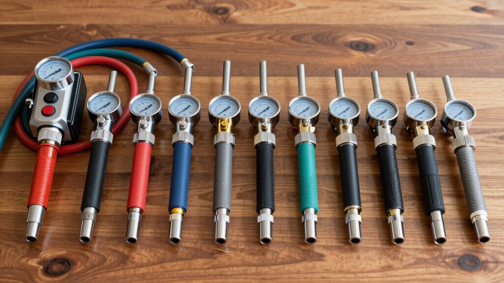 Measurement and pressure gauges are essential components of a vacuum brake bleeder pump because they provide real-time readings that enable precise control during fluid bleeding and system testing. Accurate gauges typically measure vacuum in inches Hg (in/Hg) or mm Hg, with common ranges from 0-30 in Hg or 0-760 mm Hg, suitable for automotive use. Dual-scale gauges that display both vacuum and pressure are versatile, aiding in diagnosing various vehicle systems. High-quality gauges feature clear, easy-to-read dials with fine graduations, allowing detection of even slight pressure changes for troubleshooting. Durability is vital; reliable gauges are made from materials resistant to brake fluid and temperature fluctuations, ensuring consistent calibration and accuracy over time. Choosing the right gauge enhances your ability to perform precise, safe brake system maintenance.
