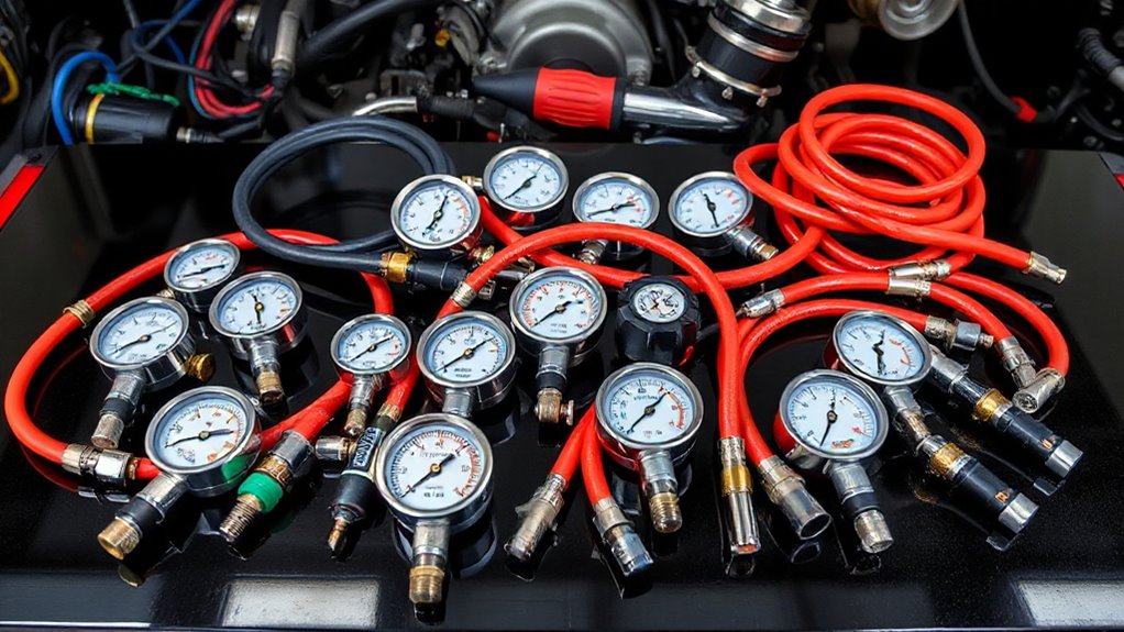 Imagine handling a delicate glass sculpture; that’s how careful you need to be. I always wear gloves and eye protection to guard against unexpected bursts of pressure. I confirm the engine is off and cool before testing, and I double-check all connections for leaks. Ventilate the area well, and never exceed recommended pressure limits. These precautions keep me safe while I diagnose and keep my engine running smoothly.